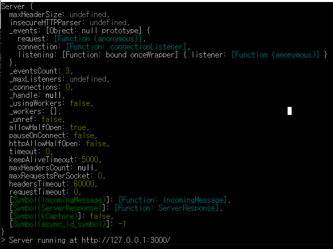 코드의 server.listen안에 ``(백틱)을 이용하여 로그를 찍었던 변수 값들이 127.0.0.1:3000 으로 출력되는 것을 볼 수 있다.