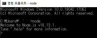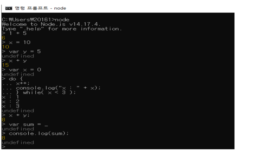 Window의 cmd에서 node 명령을 치면 REPL 환경으로 접속이 가능하다.