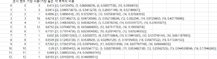 if j == 0: # 정렬을 한 상태이므로 가장 앞에 있는 것이 가장 비중이 높은 토픽