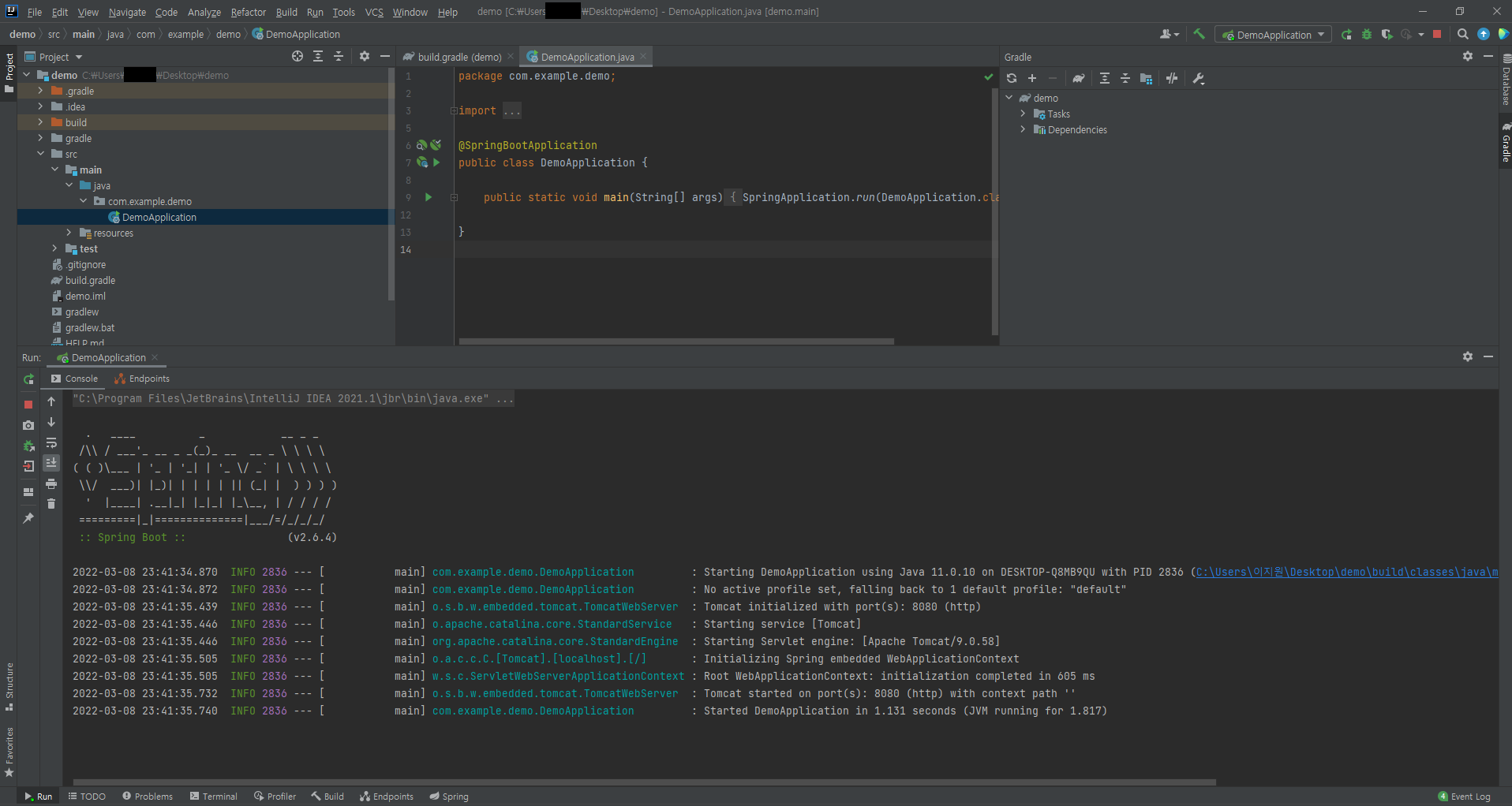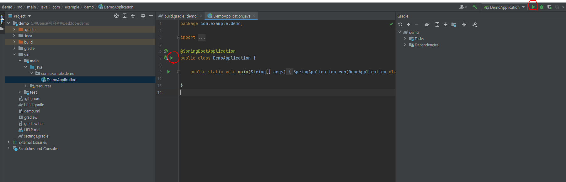 이 후 demo -> src -> main -> java -> com.example.demo -> DemoApplication에서 아이콘을 클릭 또는 우측 상단의 DemoApplication의 시작 버튼을 눌러 시작 가능