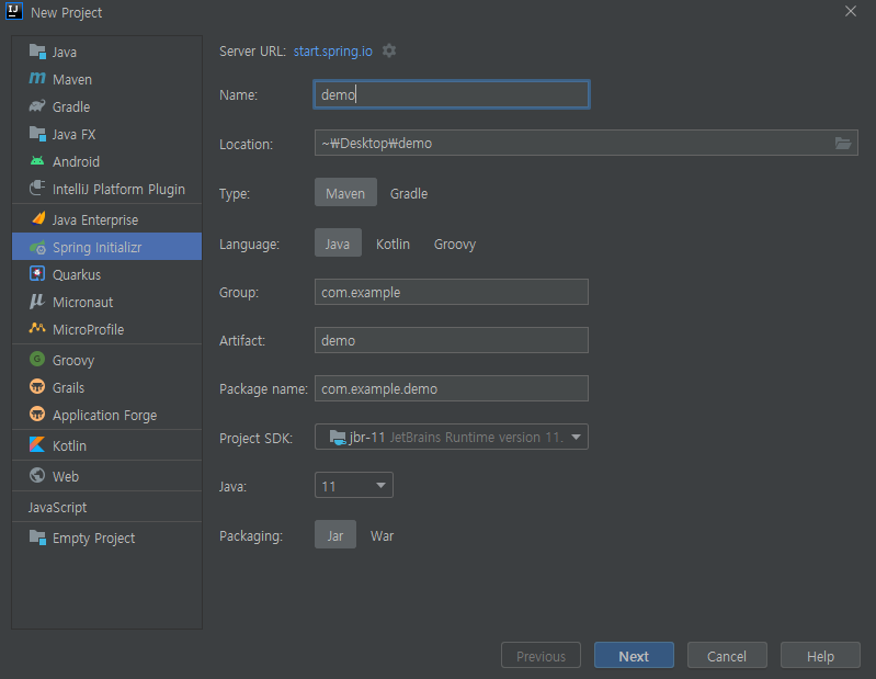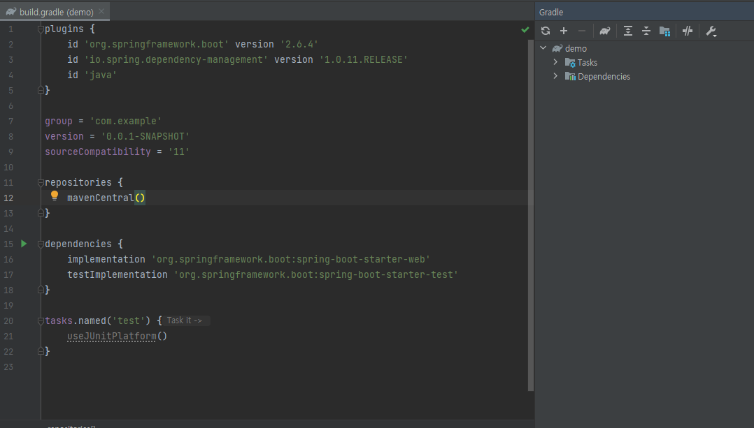좌측 Project 의 demo -> build.gradle 에 프로젝트 생성 시 설정했던 값들이 나옵니다.