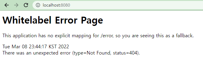그러나 서버를 보면 다음과 같이 Error Page라는 명령이 뜨는데 그 이유는 서버를 만들고 Page에 대한 어떤 내용도 넣지 않아서 그렇다. 그래서 정적 파일을 html, css, js 등을 resources의 static 폴더 하위에 추가해 주어야 한다.