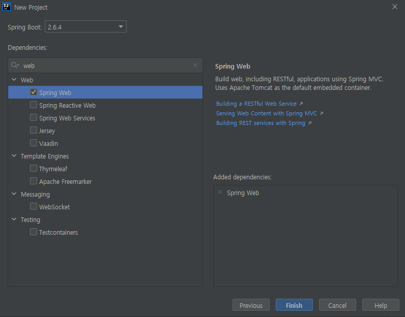 기본적으로 Web을 구성할 것이기 때문에 Spring Web만 받아온 후 Finish를 누르면 프로젝트가 생성됩니다.