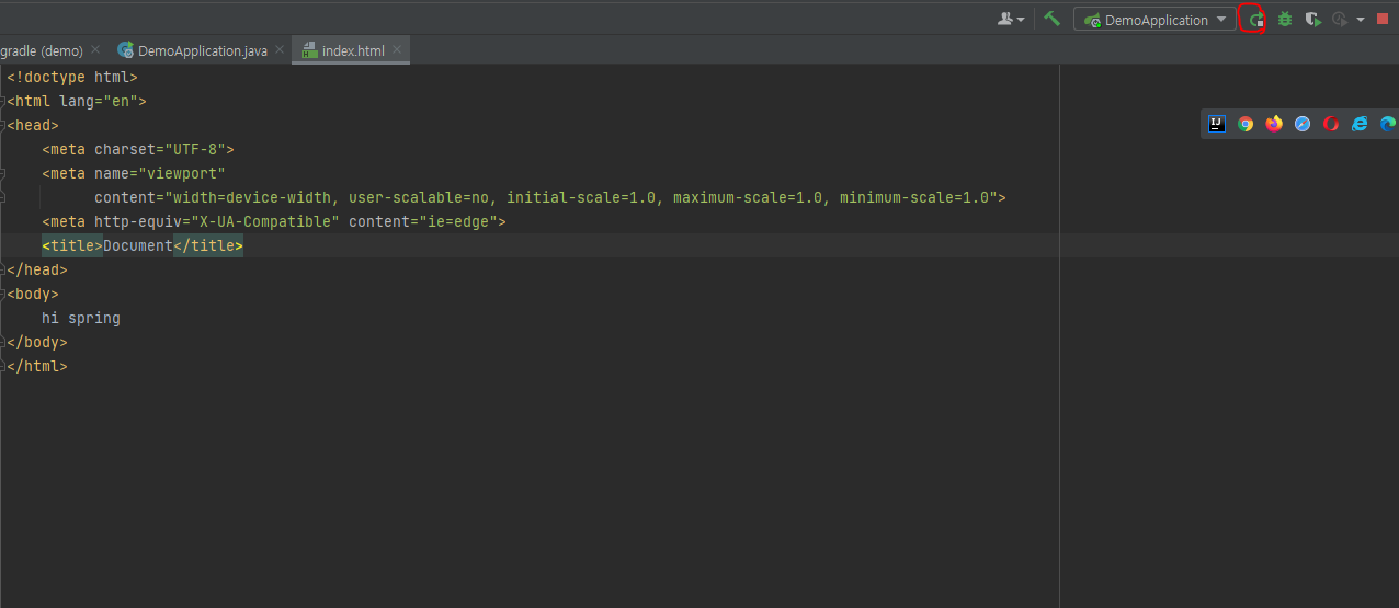다음과 같이 resources 하위의 static 하위에 index.html 이라는 파일을 만들어 ! + tab 을 해주면 기본 html 문서가 출력된다. 따라서 html 문서의 body 부분에 'hi spring' 이라는 내용을 넣고 서버를 껐다 켜주면 서버에 오류 없이 출력되는 것을 볼 수 있다.